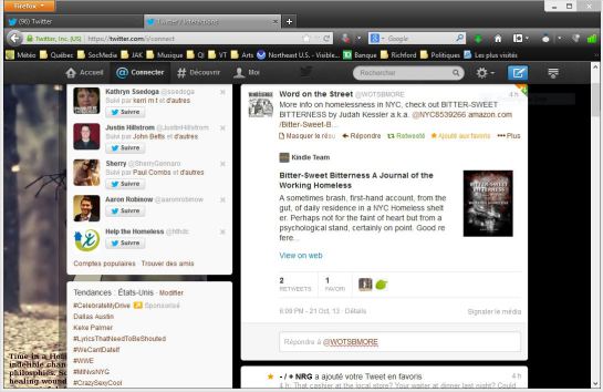 Tue.29.Oct: 7.18 Minus 4. Why bother waking up anyway? My stomach just cramped. Frost on the windows. And another day closer to having nothing. Another day of being reminded just how useless I am to others. How worthless I’ve been to the world. Oh well… – inagist-ellentwitter Temperatures on Friday are supposed to get up to about 17! Too bad it’s supposed to rain, but 17, after minus 4? November? Check-out? WTF? Why not? No rain today. I can move shit from the house to the barn. No prob. Buh-bye. OK. Luv ya, buh-bye. – Oh, another day. – It’s 24.29 I have one cigarette left until Friday. I’m as hungry as I can be. I don’t even know why the hell I’m still awake. But my guts are being stabbed by such cramps that I could scream aloud. And yet, here I am, in bed, awake, typing the day’s events. And they were quite… QUITE! – Meanwhile, before getting into the day: it is HOT in this room tonight! It’s minus2 out there. Frost on the cars in the lot across the road. And yet, it’s HOT in this room! And if it’s hot in this room, the rest of the house must be like an oven! In fact, tonight, as I washed a shit-load of dishes, I actually broke a sweat! Hmm… this after this morning… which I get into here and now: It was “crisp” in the room this morning. I mean, not just cold, but “crisp” cold. When I went down-stairs for the 11am morning smoke (yes, I waiting until then to have my first drags) I noticed that the pellet stove wasn’t functioning but Lyle and Randy were fast asleep so I thought perhaps Lyle had turned it very much down for the night. Little did I know, it had turned itself off! Imagine that! Oddly though, the house wasn’t at all too cold. But there were quite some chuckles to be had later when Lyle and Randy both complained that it had gotten way too cold for their comfort. Well… for me, it was just another “Richford”… sitting in the house with 7 layers of clothing on including the hood of my sweat-shirt. Oh well kiddies. Imagine… I’m the one in the house who can take the cold in here! The skinny one! The one who’s actually so under-nourished I’m probably on the verge of death. But the cold? No problemme! It’s something I’ve adjusted to, I suppose. Pretty good, I must say, for me. – Next comes the accomplishments of this day and they are rather several. l’AtelierQcVt isnow all over the Internet! The site, Facebook, Twitter, Tumblr, About.me, and today… LinkedIn and WordPress! When I’d finished the WordPress blog/site, I hit Google for a search and of all the things to come up FIRST: a Twitter post I made to Ellen deGeneres! A second item: a Twitter post I made to Oprah Winfrey! Now, I wonder if either of them will take notice and if so what, if anything, they’ll do to help! And right now I need all the HELP I can possibly get! But before I get along with that thought, let me just say that I almost plotzed when I saw the association between l’AtelierQcVt and those two! Especially after working just about 8 hours through all day to get the web presence up and running. It was a LOT of work! But I’ll hope it makes a difference.. BEFORE it’s too late! – Now… moving along… dinner was delicious and filling tonight… meatloaf and potatoes and I had 2 helpings (but could have taken more, apparently, because I’m just about starved). After, Bob made cakes for the job tomorrow and devilled eggs. Thing that bothered me the most was when he used black olives for the eggs and when he put the left-overs into the plastic container, there was a lot of the brine, which I happen to like. BUT Randy made sure that he put that brine into a bowl with some kind of food-stuff in it so that I couldn’t get at it… and just as I’d gotten a glass to put the overage in! It just makes me sick when I see how much food is wasted round here, how much Randy takes and then gives to the dogs (who shouldn’t be eating table food to begin with). Oh well… – But, this afternoon I mentioned to the Old Lady the issue about my storage and he wasted no time in running to Lyle to repeat. In fact, it was in the time it took for me to smoke half a cigarette! Lyle asked me tonight, as I washed the dishes, how much it would take to “save” the storage for at least another month. He doesn’t claim that he can afford it, but he’s willing to HELP! me. I’m just so astonished! (But it’s now 24.49 and I’m finally pooping out so I’m going to nap now… Come the morning, there’s more shit to deal with and I’ll finish this and post then.) – Finishing… Lyle got a bit on the teary side as he spoke about losing my art work and such in storage. he said he couldn’t imagine letting that happen to me. (Me, of course, I’m thinking… that’s for now… but when sanity kicks in…) – Anyway, I got all the dishes done. It wasn’t that there were a lot of them, but they were big, for the most part. I took my time. The iPod fucked-off before I’d done. And tonight, as I washed and listened to Francis Cabrel? I almost broke-down and cried. I can’t stand missing the old house in Richford. I do miss Silas at times and wonder if he hates me and if so, why so. It would be nice to be in touch with him… even at a distance. It would be a delight to be back in Richford. I don’t know exactly why I miss that town so much, but I do. It was lonely at times. It was COLD most of the time. But some-how, that town became something of a “home”-town to me and I do miss it very much. – inagist-oprah Dishes done and a quick halfie out-side I sat a while with Lyle and then came up to the room. I was tired and ready for sleep when I came up but for some reason, as the night went along, I couldn’t sleep. Of course, it’s nerves, disappointment in my self and others, wondering when, how, if, and all the rest. It’s making me quite ill… mentally, spiritually, emotionally, and soon… physically. I just wait for the morning when I walk
