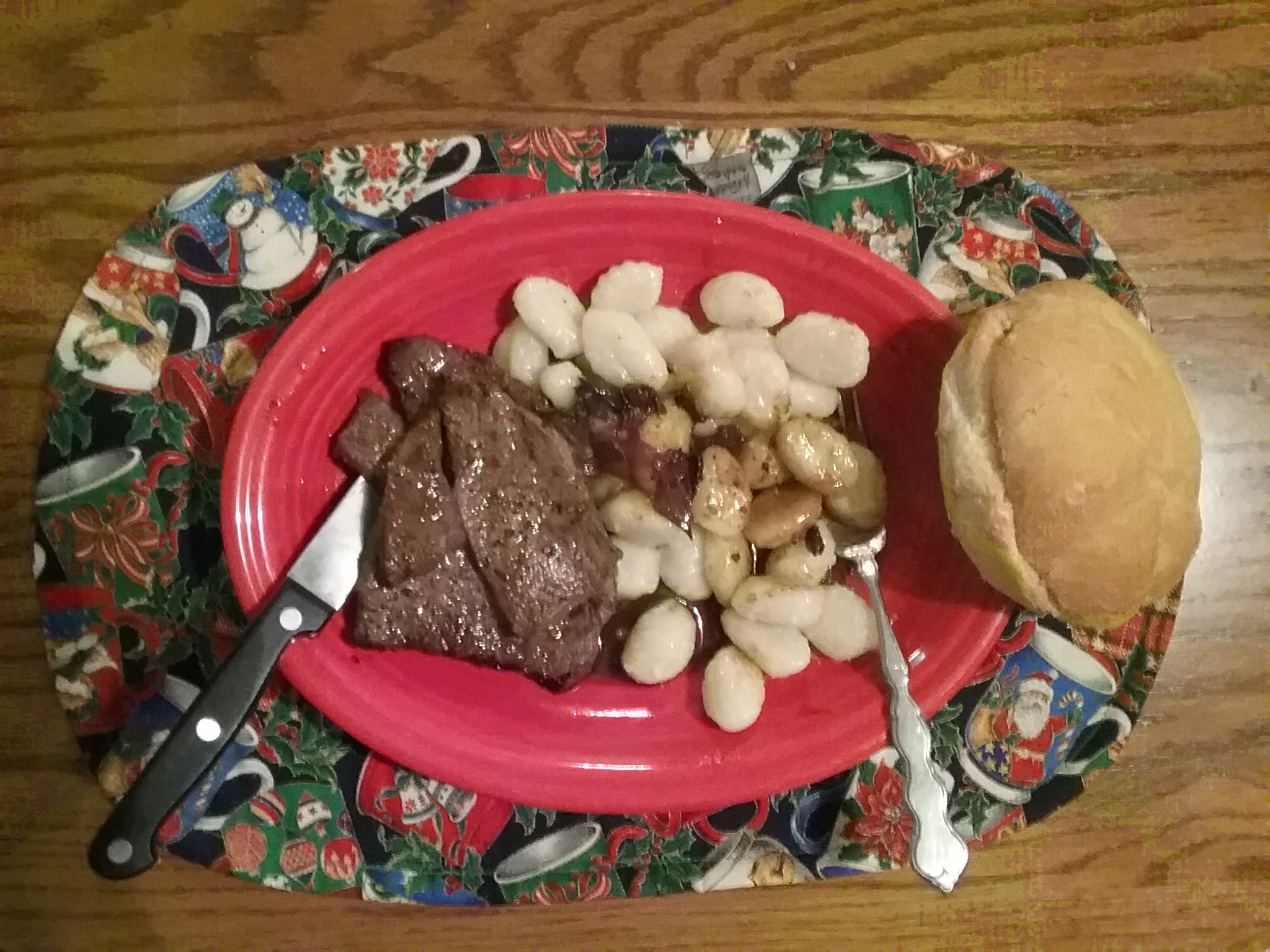 VENISON!!!! FRIED IN BUTTER, SALT, PEPPER, BITS OF ONION AND A SPLASH OF WHITE WHINE! GNOCCHI WITH, NICE BUTTERED ROLL... VENISON DINNER!!!!