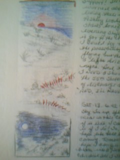 DREAM: Liz (Colbert) and I are attending some benefit do in some high society. I am spending most of my time moving about trying to avoid her. There is a woman there who has been giving me food. I’m not grateful to her because she’s only given food and not another thing. I need a home. I’m homeless. But I feel I must thank for the food and do so by way of telling her that people are making compliments on my weight gain. (This woman looks like Mrs. Farnaby from “Mulberry” but is Margot (Baldinger)). I bolt for the door to get back to the train station. Some women are talking about “the old rail line” and the schedule and cost of tickets. I’m very glad to see these people. I run, RUN down the dirt road (17k) toward the sun-set. There are translucent stones along the way (beach). A woman yells to me “You can carry your back-pack too, at no extra charge!” We laugh. I see the sun-set, stop running and yell “Why am I not here? Why am I not there?” I’m sobbing. 9.9