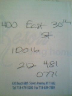 dialysis. I’ll be on the floor alone. ALONE! Oh, but Kleym asked AGAIN if I don’t’ have friends or family. Again, I told her that I wouldn’t’ be here if I did. My Mother didn’t raise a beggar or an abuser. But… I’m ALONE, ALONE, ALONE, AGAIN. – 14h19 Roseanne acme in all cheerie. “We found a place for you. “ She hands me a post-note. On it is the address for the Shelter Intake Center on E.30th. I could have gone there on my own but Roseanne says “Arlene” is the person who confirmed this. As I write, she, Roseanne, is going to get me a Metro Card to get into The City. I’m looking at a night on the subway. It’s too late to go to Tilden. It would do me no good right now anyway. I’ll take a shower then go. Rozann gave me a 4-dollar card and 2 dollars “for coffee.”