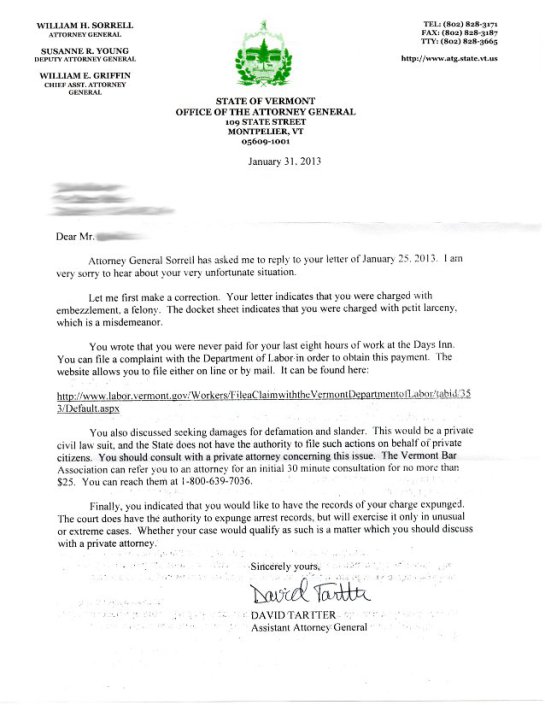 31 January 2013: For 6 months I have been refused employment because of this. For 6 months I have had to live with the destruction this has caused in spite of the fact that the entire case and charges were dismissed and “No Judgement” was the final decision. But the damage has been done. Meanwhile, Mrs. Olsen continues her own life and business, un-touched, un-scathed. Obviously, in Vermont, a person can say what-ever s/he wants about another, defame in any manner that happens to amuse at the moment, lie about another person, bring the law into their demented production and even the law will co-operate by participating in the devastation. This is, after all, what Mrs. Dianne/Dyan Olsen has done to me. And here is the proof, not only of the charges, but the fact that, even after months of having tried to procure the services of a “private lawyer” in Vermont (all of whom have done nothing but push me off with “I am sorry to hear of your misfortune…. We cannot take your case.”) even the Attorney General permits this insanity. So here, this is only a part of my response: to make public, the documents and the facts behind them.