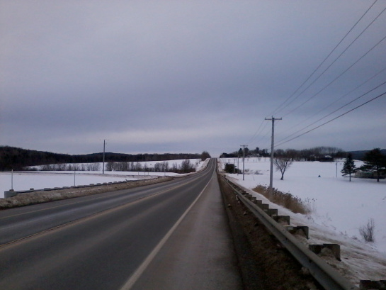 Another coffee, another episode of “Vicar” and that was the end of it. A few dishes left in the sink, I decided that *I* wanted to get HOME today. I’d sent a few e-mails asking Silas if he was coming up to the house at any time over the week-end, hoping that we might spend a bit of time together, just relaxing and browsing through a few shop(pe)s and such, perhaps stopping for a tea, bite to eat, something low-key but generally “fun”. I don’t have much money these days, but I was willing to put aside my own considerations and spend a bit on a “friend”. Well, not one of those e-mails got a reply… how terribly typical. But that didn’t discourage me. Not in the least. Off I went, to shower and dress. The weather forecast light rains for after 17.00 and temperatures just above freezing. The temperatures, low as they might be, are actually rather “balmy” now, and perfect for walking distances. final quick check on the weather and the distance between here in the gloom of “Depression and Despondence” and the Peace and Joy of HOME: 16km… not too bad! I figured I should be able to cover each way in about 2 hours, and the time would just sail by… and most of it would be me, ON HOME SOIL! How WONDERFUL! And… if my body couldn’t take the strain at this point? Who really gives a shit? Heart attack or any debilitating occurrence would take place on HOME SOIL! If need be, I could simply veer off the road, into a nice little pine-stand or meadow, dig myself in and, at last, STAY HOME! for EVER! If I DID manage to make the trip through, well then, how WONDERFUL to spend time with BRILLIANT people who have never promised me anything, have always treated me with kindness, respect and dignity all too simply because that is how THEY, themselves wish to be treated. How MARVELOUS to spend time with people who are intelligent, who can communicate in at least TWO languages and LIVE TWO cultures! How REFRESHING to escape from this monotony here, even for a few hours!!! – Just before noon, I was (over)dressed and out the door. The day’s walking adventure had begun! To the banque for a few bucks (OK, a “few” more than I can actually afford but, since I’m on my own now, the money is my own now and *I* will do with it as *I* damned-well please and *I* damned-well please to take it the fuck out of this bloodfuck country and put it where it will be appreciated… HOME!) and at precisely 12.30, I was crossing the Missisquoi on the Richford bridge and “en route”! The sky was heavy grey, the temperature was just delightful, the air only just moved a bit, not even enough to be called a “breeze”. And I was truly “over-dressed” for a walk… several layers and the Connecticut boots. Oh well.. – As I walked past the US Customs building, a “guard” (so to speak) came out of the building and stared at me. I looked toward him, waiting for some snide remark to be made and wasn’t too disappointed when he called “Are you walking to Canada?” In no mood and knowing he had nothing at all on me, I kindly replied “No. Only as far as Québec.” knowing full-well he’d NEVER understand the fact or nuance of what I’d said. “Where are you starting from ?” he called. “Richford.” I politely replied. “How far are you going?” he followed, in a more “intriqued” tone than interrogational. “Just to Sutton. I have some shopping to do and it’s closer than Enosburgh, oddly enough.” “That’s still a long walk.” “Worth every step of the way. I’m originally from NYC and we’re walkers.” And I simply continued. – At les Douanes, M. Champagne (true, that is his name), wasn’t only a delight to chat with, but as expeditious as could possibly be. Yes, I’m STILL under scrutiny (thanks to that piece of useless nothing in Shelburne), but true to form, Canada comes through and the records show that all’s well. I sat for only brief moments in the little office and then, with a great and kindly smile from the wonderful M. Champagne, I was on the road, past the gate and ON THE SOIL OF HOME! The road just lay out before me. It was tremendous! As I passed the signs (in French) that Silas and I had passed a few times before and he delighted in, reading them with an English slant and me laughing because, well, it truly is funny, I stopped to take a couple of photos to send to him (both, as a reminder of good times and too, to prove that indeed, I actually was walking to Sutton today… alone… walking). I had no idea how long this trek was going to be, the only time constraint was to beat the impending rains, but there I was, not on the road TO HOME, but ON the road AT HOME! And I was just wonderful! (In spite of the fact that I’d already broken into sweat from the heat built-up under all those layers of sweat-shirts and jacket, and the boots were entirely TOO heavy for all this sort of walking.) – The strangest thought came to mind though, as I walked along, listening to the air, only the air, absorbing it through every possible means: French… it wasn’t a matter at all any longer. I’ve been SO alone for SO long now, hearing almost nothing but, thinking aloud in nothing but, that, once again, as in the days when I lived the language, it was no longer “foreign” to me. The signs read simply, easily. Nothing different about them. Nothing unique. They made perfect sense. No slight tensions about having to use the language. I was aware that my vocabulary wasn’t what it should be, but that I had more than enough to get my point across and could understand enough to continue a conversation. But the over-all sensation and realisation was… yes, in fact, I was HOME again! Comfortable on a road that I’d travelled only a few times, never alone and never on foot, but it was new and yet, some-how, it was mine and I belonged on it. The language and the geography were “mine”. I was… at HOME! And it was intensely MAGNIFICENT! And with this in 