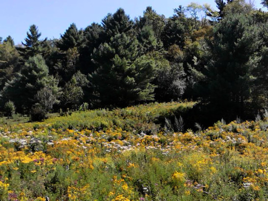 This is the mountain I’d used as navigation between Richford and Sutton. This is the mountain that I could see WAY off in the distance from Saint-Armand. This is the mountain that I can see from the N.Sheldon Rd. Here I was, just about at le pinacle de LE PINACLE! I’d WALKED UP THE MOUNTAIN! If I hadn’t been SO dehydrated and hungry and soaked-through with sweat, I’d’ve been SINGING AT THE TOP OF MY LUNGS! (Oddly enough, I hadn’t even listened to any music all day today. Usually I have the Québec country music blaring in one ear. Not today, for some reason. Today was for Peace.) WELL! My spirits lightened quite a bit with the awe-inspiring views from up there… off toward Sutton, and down into VT. AND… my mood lightened to think: Once at the top, the mountain HAS to go DOWN! And so, I got to the point where indeed, the road stopped climbing and began descending! It was just about at this point where the hunger started to take hold too. I was feeling at the point of just giving up and giving in when… would you believe? JUST as in my past, on the long, LONG journeys I’ve taken (including the 25mi. hike to the market on my birthday in Roosa Gap)… APPLES! RIGHT THERE AT THE ROAD-SIDE! APPLES! So, I stopped, grabbed 5, put them into the little blue zip lunch bag on the handle bars and, as I coasted DOWN le Pinacle, I ate… 4 of them! And what a differnce they made in my over-all and general being! It’s strange as I thought then and think now:This sort of shit happens to me many times through-out my life-time. I’m out, walking, alone, tired, dehydrating, hungry, tired, exhausted and just as I’m at the brink… an apple tree, a berry bush… something, growing wild, there to “help”. I’ve never understood it. It’s always made me stop to wonder… Who? How? Why? But even in The Bronx! In NYC! Berry bushes. Mulberry trees. In Tilden: beach plums (I’m missing them this year). Squash.