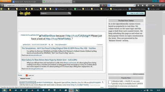Tue.29.Oct: 7.18 Minus 4. Why bother waking up anyway? My stomach just cramped. Frost on the windows. And another day closer to having nothing. Another day of being reminded just how useless I am to others. How worthless I’ve been to the world. Oh well… – inagist-ellentwitter Temperatures on Friday are supposed to get up to about 17! Too bad it’s supposed to rain, but 17, after minus 4? November? Check-out? WTF? Why not? No rain today. I can move shit from the house to the barn. No prob. Buh-bye. OK. Luv ya, buh-bye. – Oh, another day. – It’s 24.29 I have one cigarette left until Friday. I’m as hungry as I can be. I don’t even know why the hell I’m still awake. But my guts are being stabbed by such cramps that I could scream aloud. And yet, here I am, in bed, awake, typing the day’s events. And they were quite… QUITE! – Meanwhile, before getting into the day: it is HOT in this room tonight! It’s minus2 out there. Frost on the cars in the lot across the road. And yet, it’s HOT in this room! And if it’s hot in this room, the rest of the house must be like an oven! In fact, tonight, as I washed a shit-load of dishes, I actually broke a sweat! Hmm… this after this morning… which I get into here and now: It was “crisp” in the room this morning. I mean, not just cold, but “crisp” cold. When I went down-stairs for the 11am morning smoke (yes, I waiting until then to have my first drags) I noticed that the pellet stove wasn’t functioning but Lyle and Randy were fast asleep so I thought perhaps Lyle had turned it very much down for the night. Little did I know, it had turned itself off! Imagine that! Oddly though, the house wasn’t at all too cold. But there were quite some chuckles to be had later when Lyle and Randy both complained that it had gotten way too cold for their comfort. Well… for me, it was just another “Richford”… sitting in the house with 7 layers of clothing on including the hood of my sweat-shirt. Oh well kiddies. Imagine… I’m the one in the house who can take the cold in here! The skinny one! The one who’s actually so under-nourished I’m probably on the verge of death. But the cold? No problemme! It’s something I’ve adjusted to, I suppose. Pretty good, I must say, for me. – Next comes the accomplishments of this day and they are rather several. l’AtelierQcVt isnow all over the Internet! The site, Facebook, Twitter, Tumblr, About.me, and today… LinkedIn and WordPress! When I’d finished the WordPress blog/site, I hit Google for a search and of all the things to come up FIRST: a Twitter post I made to Ellen deGeneres! A second item: a Twitter post I made to Oprah Winfrey! Now, I wonder if either of them will take notice and if so what, if anything, they’ll do to help! And right now I need all the HELP I can possibly get! But before I get along with that thought, let me just say that I almost plotzed when I saw the association between l’AtelierQcVt and those two! Especially after working just about 8 hours through all day to get the web presence up and running. It was a LOT of work! But I’ll hope it makes a difference.. BEFORE it’s too late! – Now… moving along… dinner was delicious and filling tonight… meatloaf and potatoes and I had 2 helpings (but could have taken more, apparently, because I’m just about starved). After, Bob made cakes for the job tomorrow and devilled eggs. Thing that bothered me the most was when he used black olives for the eggs and when he put the left-overs into the plastic container, there was a lot of the brine, which I happen to like. BUT Randy made sure that he put that brine into a bowl with some kind of food-stuff in it so that I couldn’t get at it… and just as I’d gotten a glass to put the overage in! It just makes me sick when I see how much food is wasted round here, how much Randy takes and then gives to the dogs (who shouldn’t be eating table food to begin with). Oh well… – But, this afternoon I mentioned to the Old Lady the issue about my storage and he wasted no time in running to Lyle to repeat. In fact, it was in the time it took for me to smoke half a cigarette! Lyle asked me tonight, as I washed the dishes, how much it would take to “save” the storage for at least another month. He doesn’t claim that he can afford it, but he’s willing to HELP! me. I’m just so astonished! (But it’s now 24.49 and I’m finally pooping out so I’m going to nap now… Come the morning, there’s more shit to deal with and I’ll finish this and post then.) – Finishing… Lyle got a bit on the teary side as he spoke about losing my art work and such in storage. he said he couldn’t imagine letting that happen to me. (Me, of course, I’m thinking… that’s for now… but when sanity kicks in…) – Anyway, I got all the dishes done. It wasn’t that there were a lot of them, but they were big, for the most part. I took my time. The iPod fucked-off before I’d done. And tonight, as I washed and listened to Francis Cabrel? I almost broke-down and cried. I can’t stand missing the old house in Richford. I do miss Silas at times and wonder if he hates me and if so, why so. It would be nice to be in touch with him… even at a distance. It would be a delight to be back in Richford. I don’t know exactly why I miss that town so much, but I do. It was lonely at times. It was COLD most of the time. But some-how, that town became something of a “home”-town to me and I do miss it very much. – inagist-oprah Dishes done and a quick halfie out-side I sat a while with Lyle and then came up to the room. I was tired and ready for sleep when I came up but for some reason, as the night went along, I couldn’t sleep. Of course, it’s nerves, disappointment in my self and others, wondering when, how, if, and all the rest. It’s making me quite ill… mentally, spiritually, emotionally, and soon… physically. I just wait for the morning when I walk
