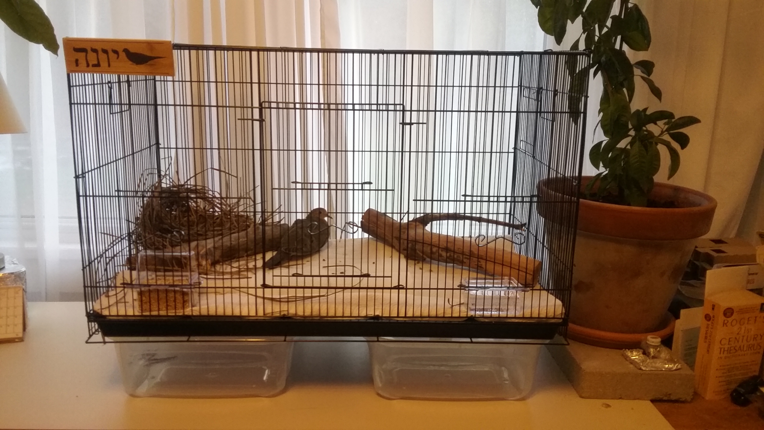 YONAH IS IN HER NEW HOUSE TONIGHT! OMG! COREY DELIVERED AT ABOUT 17.20 AND I QUICKLY FINISHED MY FRANKS (and French onion soup) AND BEFORE I DID DISHES OR HAD ICE CREAM... I PUT THE NEW HOUSE TOGETHER AND GOT HER (WITH A RUN THROUGH THE KITCHEN) INTO IT! SHE WENT TO THE LITTLE BIT OF LIMB WITH THE EXTENSION AND PERCHED ON IT FOR THE LONGEST WHILE. I'VE JUST CHECK-IN ON HER AND ... SHE'S IN HER NEW, FRESH NEST NOW! - TJE NEW HOME IS “HERS” NOW! ALL I COLD DO WAS “HOLD ME”. I'D SO LOVE TO BE ABLE TO HOLD HER, CLOSE, TO SOME-HOW LET HER KNOW, IN SOME WAY, THAT SHE'S SAFE HERE. BUT SEEING HER IN THE NEST SOME-HOW GIVES ME THE STRENGTH AND DETERMINATION TO MAKE SURE SHE'LL BE GOOD ENOUGH TO TAKE FREE FLIGHT COME THE BETTER WEATHER, TO RETURN TO HER LIFE. THE NEW HOME LOOKS SO MUCH NICER. IT'S HIGHER FOR HER TO SPREAD AND EXERCISE HER WINGS. AND EASIER TO GET HER OUT OF, SO SHE CAN HAVE RUN OF THE HOUSE, TO RUN ABOUT. THERE'S SO MUCH FOOD AND WATER FOR HER NOW THAT I DON'T HAVE TO WORRY ABOUT HER NOURISHMENT NEEDS. IT WAS A BIT OF A COSTLY INVESTMENT... BUT IF I HAVE TO FORFIET MY FOOD AND SUCH... IT'S ALL SO MUCH WORTH IT! SHE'S SO PRECIOUS!