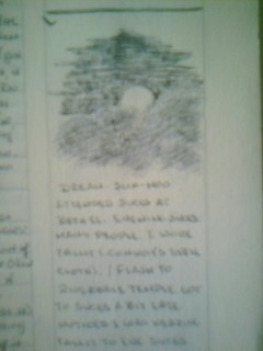 SAT.23 It’s 19h20 The clock shows 25 degrees in here. I’m in T6, radio playing CBS-FM. I’m feeling like sht. Headache. Fatigued. Unsettled stomach. Everything in and about me is hoping to be able to stay the night. It’s been a terrible day. – We all woke at about 7h this morning. I came over to T6 to make coffee. Geoff was already here. A group from the Mormons were due to arrive at 8h to do some work around the place for 3 hours. I was tired, fatigued, out of sorts, in no mood for much of anything. The sun was hot. But I just pushed myself through. Eventually Christen went for Dunkin Donuts. (They ate them. I had a few “holes”.) I cleaned the back yard of T6 and tried to fix the broken zip on the “Brighton” bag (and I’ve failed) for most of the day. Penelope came. There was a lot of noise all over the place! P. sculpting, the work crew banging, people moving all around. I took Matt out to the Bakfort in search of beach plumbs. We found several little bushes out by the fresh water pond. Brought some back. – All I wanted to do is find a shady place in which to sleep, but tried for same bench I tried to sleep on last night. It was in too much sun. – 14h and everybody (Tommy, Christen, Matt and Tony) left for a day on the Dragon Boat. They’d eaten lunch on the front porch of T7. I wasn’t invited. I didn’t invite myself. So, when they left, I came in to T6 to sketch and be with Penelope. – I NEED to cut my hair! I NEED to wash my clothes (even though P. says I’m amazingly clean. You’d never know I’d been in these clothes, in the dunes, the woods, painting, etc every day for a week!) I also NEED to wash the sheets I’ve been sleeping on. – So at about 17h, P. took off, leaving me to lock up and “do what you do”. The breeze in the parking lot was chilly. When I mentioned going out to the Bakfort, she said “Don’t go back there tonight. You need to stay inside tonight. Stay right there. By now they all know your situation and I don’t think anybody would say anything.” I reminded her that the crew was out on the boat and would probably be back around 2h Sunday morning. She just said “So?” We left it at that. Now, at 19h44, the sun is setting, I ache. I’m trying to figure whether or not I should stay. I‘m thinking that I could just tell the truth about not feeling well enough to traipse out to the woods, needing the loo, etc. After all, is there really any harm in being here? – NOTE: I’m sick about losing what was left at the hotel. I’m sick about not being able to get it because I have NO money. I can’t call because I have no time on the phone. I’ve got ONE fare on my MetroCard. The coming week-end is Labour Day. I won’t be able to find a room out here. I just have so much running through my head that’s making me physically sick! – The rubber band on my bottom teeth needs replacing too now. – OF INTREST: This morning Tommy asked me how I am with talking to Albert’s Liz. She and I spoke about The Fort last night. I said I have no intention of being friendly with her and he told me “She’s a hole and if you fall into it you’ll never get out! That whole family’s no good.” Emily, the daughter, did some work for RAA a while ago and tried to collect unemployment. When she couldn’t, it went to the Labour Board. It cost RAA thousands! Lately, Apryl, the sister, has used T7 for band rehearsal, giving no notice, no fee, and has billed her band for some fete being held at RAA. Unilateral decisions. So, I’m being protected, in a sort of way, from being further injured by them. So maybe there will be some sympathy and compassion if I’m discovered here tonight. I don’t know. Right now, as I write, I’m feeling so awful, it’ll be worth being discovered. It’s a chilly night. The sky is a bit grey. It’s 20h04. There are people going to T4. I just need to look “not too comfortable” if somebody comes during the night. But I’ll make me as comfortable as possible other-wise. I just wish I knew if anybody will come in. When the day on the boat is done, they have to come back here. Tony’s car is here. Somebody might want to use the loo. I could opt for trying to climb into T7 at some point. But that would have to be much later because there are people outside now… I don’t want to “break in” any-where and ruin any trust I’ve earned… I’d have to climb out in the morning so as not to unlock any doors… I’d have to find a place to sleep other than a sofa… too involved. Best to stay here and risk what-ever.