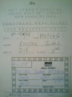 Thursday 9 October 2008 19h58 (56 Homeless/25 Shelter) YOM KIPPUR DONE. A TRULY MISERABLE DAY! THIS COLD PEAKED WHILE I WAS AT SERVICES! I SOAKED ALL MY TISSUES AND BANDANA! ABSOLUTELY SOAKED! AND HERE I SIT ON THIS BED, HOT FLASHES, TISSUE STUCK IN MY NOSE, SNEEZING, EYES DRIPPING. JUST BLOODY MISERABLE! PLEASE! LET THIS BE THE WORST OF IT. – The alarm was set for 7h and, like yesterday, I woke at 6h59. took my time getting up. I wasn’t sure if or where I’d go to services. By 8h20 I was out the door with no particular direction or destination. it looked as if it had rained last night and appeared to want to rain again. But somewhere in the streets I decided to head to 23rd to find that synagogue Riverdale Mike told be about. And so I walked along to Chelsea. the City was quiet so the walk wasn’t too much of an effort. I felt like last week’s shit 2 Fridays form tomorrow. But I got to 23rd. there, mid-block, south side, an old synagogue. I’m still uncertain how, but I simply crossed the street and walked in. A woman stood on the stairs to my right. I asked “Have services started?” “We were waiting for you.” she replied. A Latino, non-Jew (no kippa) bade me leave my back-pack down-stairs in what is a small “Beit Midrash”. I left the pack, brought my tallit. “Up-stairs to your left.” he told me. I went, non-stop, as if I’ve been there all along. In the sanctuary it was delightfully old. An old man led services, the Chazzan’s voice was pure song! I learnt later the congregation has no rabbi. But the service was magnificent! Attendance began sparse, increased, thinned. I was given a card: I opened the ark at page something-or-other. Another amazement at how comfortably I walked up to the Bimah, opened the curtain as instructed (manually) (no electric Ark here. Conservative!), continued to daven, closed, shook hands, returned to my seat. Ah, Jews. Comfort. – The schul, Emunath Israel, has a balcony and a mechitza of sorts. A Plexiglas separating 2 rows to the right. Conservative! Comfort. If only my nose and eyes weren’t dripping NON-STOP! Well, I made it through schachrit, yizkor and most of Mussaf but by 13h I couldn’t take any more. I had nothing left to blow my nose or dab my eyes. I went down to the men’s room, washed my saturated bandana, wrapped it in some paper towels, got my back-pack and departed. – The day had become almost Summery a\warm! So I walked to the end of 23rd, 11th Av, to some new “park” there. I took off the kippa and had a smoke. God forgave me even as I went to do so. I am atoning and then some: Shelter, homeless, jobless, foodless, Food Stamp-less, fasting (I did have a coffee though before leaving the shelter), friendless, alone. I am in constant atonement. – For an hour, I feigned talking on the cell-phone. Familiar? I’m getting quite good at it really.) – PIC called. Left a message. Will re-schedule Orientation. Please call back. I did. More bloody voice-friggin-mail! Why can’t they simply re-sched and tell me! It pisses me off and wastes phone time! – Anyway, I got to sit in the hot sun and the shade, going between too warm and too cold. At 15h45 I started back to Castle Bellevue. – Exhausted and SO thirsty and hungry I made an educated decision: I drank 2 green teas and finished the frosting and 3 rolls. I’m sick! I need some sort of something to combat what’s ripping at me. I ate. But about 17h I was out cold asleep. At about 20h50 I went up to sign-in and here it is, 21h09 and I’m back! It was quieter than the 20h crew. Of course, this hall cackles with the shrieks of Ricantrash. But… Hopefully I’ll be in the dark and asleep soon. – My feet are sore. My nose is raw. My eyes burn. My head aches. My heart is heavy. My thoughts are dark. – But a note before closing this day: The DHS cop who helped me the night I got this room has remained THE MOST respectful person (save my case-worker) in this entire place. He always addresses me as “Sir”, always asks how it’s going. This evening we spoke on the stair. I mentioned something about getting old. He said “One day I’ll be old too.” When I went out for my smoke after 19h, he simply wand-canned me in saying “You’re good sir. Thank you.” One good human-being in here who allows dignity. – Oh, last night, a young guy came in just ahead of me and dropped a black kippa! Another Jew in here! I wish I knew where. For all the talk of tzedaka, why are Jews in this shelter? Lip service and nothing more. – I’ve got to wash my bandana for the second time and try for some sleep here amidst the hell. – One more note, As I left this morning, I lit a cigarette. As I did, I whispered :OK God, HIT ME!” and with that, my right foot slipped on the rubber, non-skid runner! I didn’t fall. But how funny was that? – (My eyes and nose are a steady drip now.) MISERY!