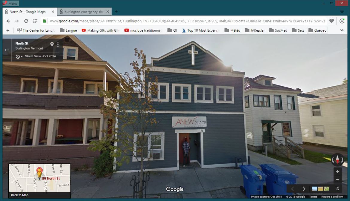 VT: Burlington Emergency Shelter BES 89 North St. Burlington VT 30 Dec. 2011 * Didn't stay the night. They put my clothes in the dryer on HIGHEST heat (claimed "bed-bugs") then LOCK-DOWN AT 21.30! In the rain, I headed to the Northway. Janice came, brought me to her house. St-Albans.